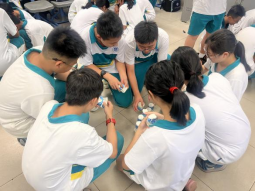 在热烈的掌声过后,陈韦同老师先“出其不意”地让同学们小组分工合作完成游戏,最后评比哪个小组的叠杯子最高最稳。游戏一开始,同学们就热火朝天地讨论着方案,场面一度十分混乱。等到小组们围起来的圈解散后,大家才发现一个“变量”:有些小组的杯子是完好的,有些小组的却是有褶皱的,更有小组抽到的纸杯是撕烂的。大家左看右看,百思不得其解,纷纷望向陈老师。可老师却留下了这个悬念,给同学们看了一段关于残疾人力克的演讲视频。