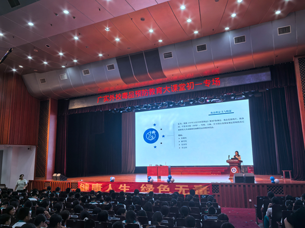 12日晚,初一年级在黄华楼礼堂开展禁毒教育讲座。讲座上,均禾街道办工作人员向同学们介绍了毒品的种类、毒品的危害及如何辨别毒品、禁毒法规等相关知识,并告诫同学们要树立防毒禁毒的意识,时刻保护自己。