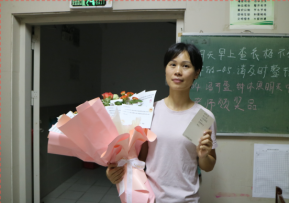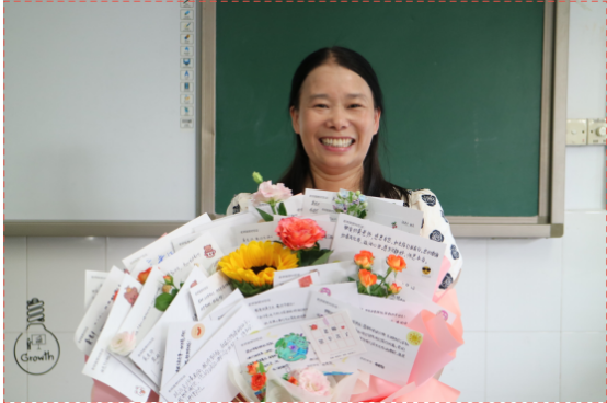 龚婉芝主任的笑容,如春日暖阳,温柔而甜美。接花瞬间,她羞涩地侧过头,双手却稳稳地托住了那份心意。她深情地凝视着花束,眼中柔情似水,仿佛能融化世间一切寒冰。回过神来,她孩子般地点了点头,轻声说:“谢谢!”在她心中,这不仅仅是一束花、几张卡,更是学生们纯真的爱与期待,是她肩上沉甸甸的责任与使命,温暖而美好。