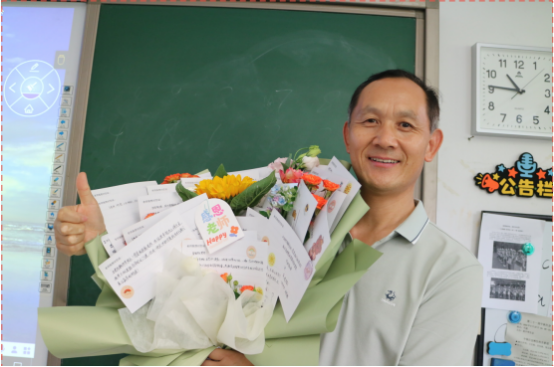 庄子睿:在这个教师节,有一个画面让我印象深刻。刘强老师收到花束后感动地说,“我忘记带纸巾了”,边说边擦了擦眼角。教室传来了一阵笑声,有些人争先恐后地递上了纸巾。花束间的一张张贺卡传递着一份份心意,希望我们的祝福能给老师们的工作和生活带来快乐和温暖。