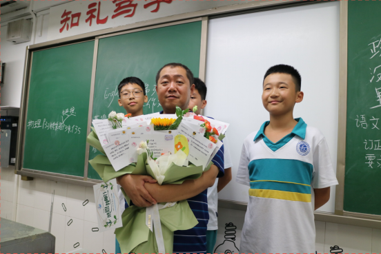 赵奕然:教师节,是对教师们辛勤付出的感恩和致敬。周末,我们全班同学提前为各科老师写好了贺卡,准备在教师节时给老师们一些惊喜。教师节当天,当我们把插满贺卡的花束送给老师时,老师们的脸上都洋溢出幸福的笑容,同学们也很开心。我想对老师们说:”你们的每一句鼓励,每一次辅导都是对我们最有力的支持和帮助,老师辛苦了!