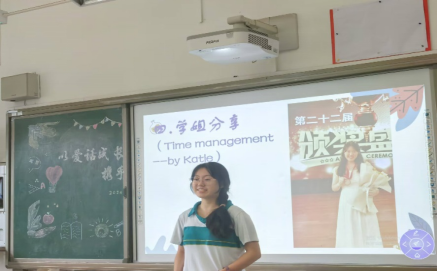 “见贤思齐焉”,学校里自律的学姐与励志的老师都是学生们学习的榜样。Katie学姐以Time Management为主题向同学们分享了自己参加竞赛、课业规划的学习经验,以高中学生的视角向大家提供初中时间管理的规划,要平衡学习与课后生活,全面而综合发展。实习助教赖老师向同学们分享从不适合运动的“羸弱”体质到达到国家三级运动员成绩的经历,告诉大家天分在成绩的取得中或许并不占关键,锚定目标后的坚守与练习也是成果不可或缺的一环。