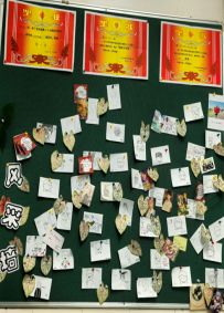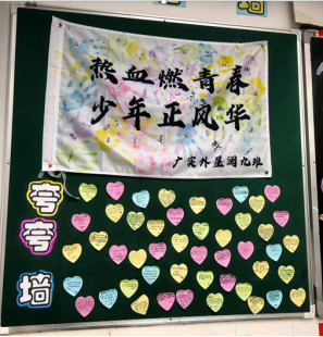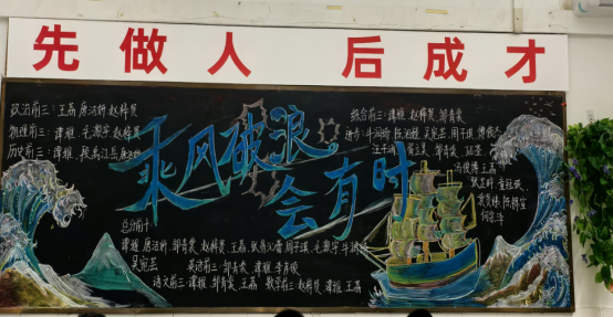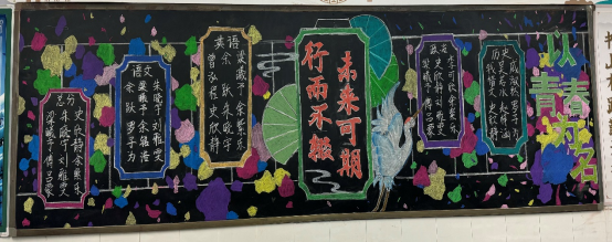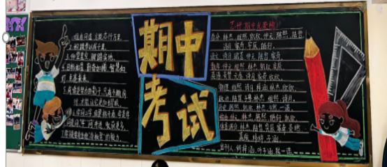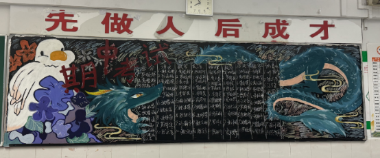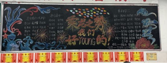 走进教室,映入眼帘的就是各班教室后绚丽多彩的黑板报。大多都以“期中考试总结”为主题,通过列出各类排名的方式警醒同学们奋发向上、勤奋学习,努力追寻自己的目标。图文并茂的黑板、盛放的花朵、飘扬的彩带、奔腾的海浪,还有象征吉祥的龙和仙鹤,无不展现着班级的精神文化。