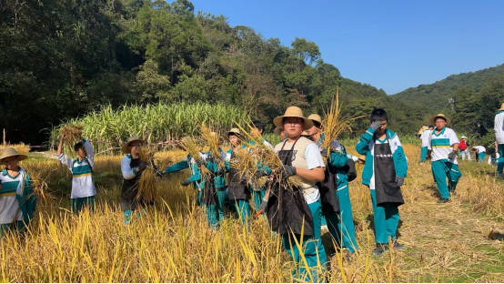 研学活动同学们最喜欢的另一项目是收稻谷,我们亲身体验收稻谷和打稻谷的过程。在一片金黄色的稻田中,同学们身穿简朴的农耕服装,手握镰刀,小心翼翼地割下成熟的稻谷。随后,同学们又在老师的指导下,学习如何使用传统的打稻工具,将稻谷从稻穗上分离出来。