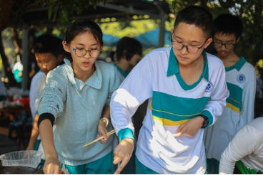 踏过石板,穿过树林,我们来到了第一站——拓染基地。在教师的指导下,同学们纷纷用橡皮筋在白手绢上扎出别致的形状。拿着自己的作品,往染水中一浸,待白手绢吸饱了水分,便将其取出,拧干。接下来,便是最激动人心的时刻——同学们用指尖轻轻捏住橡皮筋,一圈一圈将其拆下,原来叠在一起的部分便舒展开来,没扎的地方染上了青一色拓染水,扎住的地方则依然洁白,两者相交的地方颜色交织在一起,时而淡,时而深,宛若一幅素雅的中国画。不一会儿,独属于每个同学的艺术品便完成了。看着自己的作品,我们心中既是欣喜,又是激动。