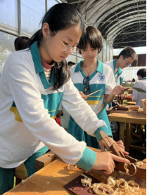 “天圆地方,七情六欲。”经过向导的讲解,大家了解到小小一支筷子竟有这么多内涵。现在,十班学子用自己的双手打造一双独属于自己的筷子,体验传统技法,感受文化传承。各位的筷子长短不一,粗细不同。可它是由一滴滴汗水凝聚而成。