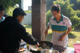 费尽九牛二虎之力,同学们已经饥肠辘辘。野炊,正是研学的核心所在——自己动手,丰衣足食。十班同学分成小组开始合作:会做饭的大厨娴熟的起锅烧油,不断翻炒;厨房小白们也不闲着,切菜分装添柴样样能行。不一会,香飘四溢,勾的人口水直流。大家稍作休息,饱餐一顿,便又踏上了下午的行程。