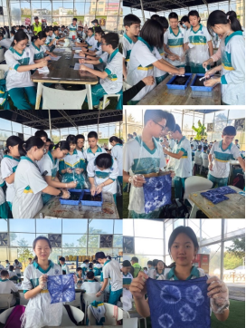 我们学习一套“青少年的广场舞”为研学热场,随后便各自随导游去扎染坊做学习非遗技艺――-扎染。导游老师教我们第一步是折叠方巾,预设好图案,在留白处要把橡皮筋捆紧。第二步是“染色”,浸泡10秒,挤干水分。我们以为很简单,但做出来的样子却远不如预期:有人橡皮筋没扎紧,染成了纯蓝色;有人没有完全浸湿染巾,颜色较浅;还有人没有拧干染料,弄得满手都是……有人淡定有人慌乱,扎染技艺的体验很快就结束了,每一项民间艺术都值得珍视,更需要有心人将她传承和发扬光大。