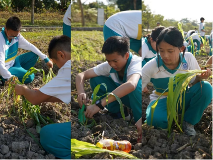 研学的最后一个活动是去地里种玉米。每个人拿到了三颗玉米苗,大家拿起铲子,挖好一个个小洞,将玉米种到土里,最后浇水。看着我们种下的玉米苗直直的站在土地上,我们心中的自豪感油然而生。
