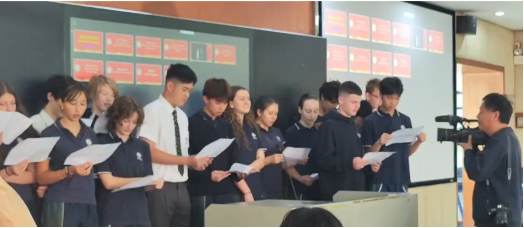 澳洲师生先到8507教室,和全体初三(13)班同学一一见面、结对。随后13班同学为远道而来的朋友举办了隆重热情的欢迎仪式。李韦彤用中英文唱了歌曲《我和你》,表达欢迎之情。澳洲同学唱了中文歌《孤勇者》,发音纯正,引来一片赞叹,原来他们在澳洲至少已经学习了两年中文。
