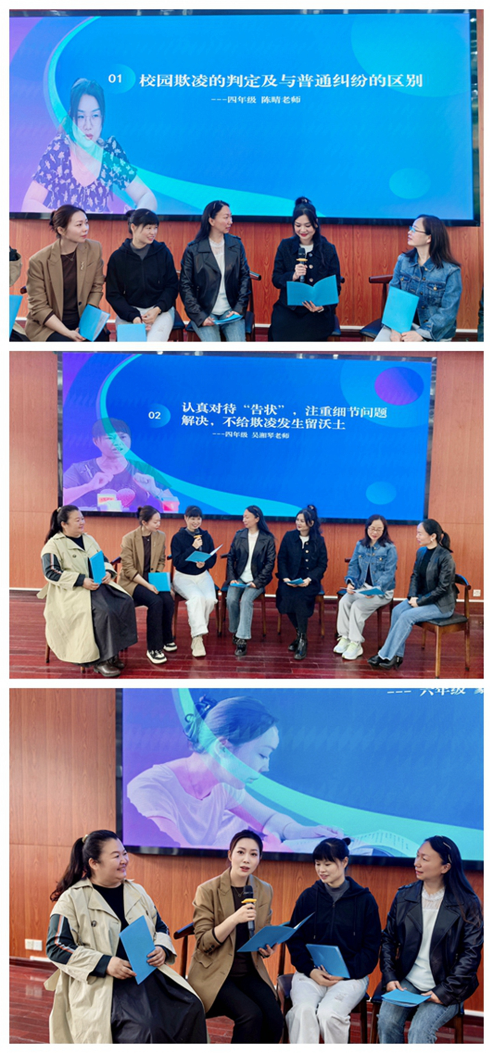 首位发言人是四年级组的陈晴老师。她提出作为带班老师要清楚的了解什么是校园欺凌并能识别和做出相关的处理工作。在详实的案例中她列举了校园欺凌的特征及与学生之间玩闹行为的区别,强调越早发现欺凌迹象越有利于问题的解决。