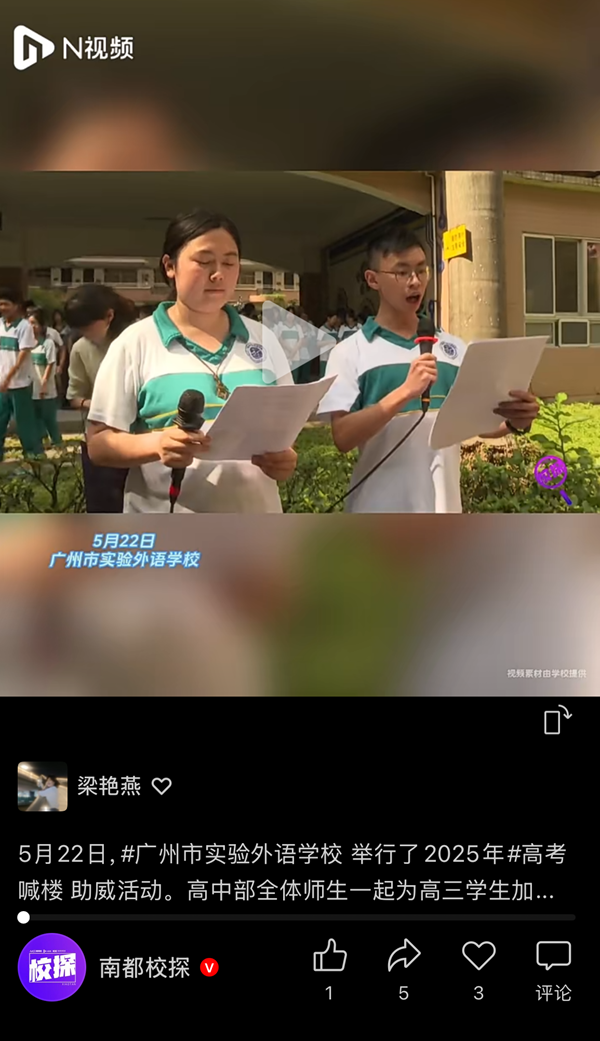 5月22日,广州市实验外语学校举行了2025年高考喊楼助威活动。高中部全体师生一起为高三学生加油,擂鼓呐喊,气势如虹;该校学生现场演唱《我的天空》,展现出活力澎拜的少年情怀和青春中最顶级的浪漫。