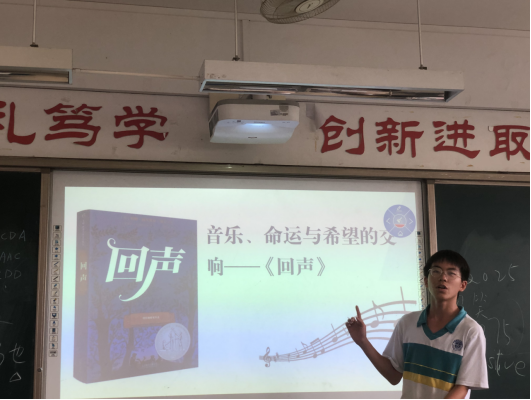张嘉航同学选择了《回声》作为分享书目。他从作品简介、故事结构、主题解析、角色分析和阅读感悟等多个维度展开分享。他深入剖析小说的现实意义,还能抓住不同人物命运交叉点去帮大家理解小说的内容,探讨其对人们精神支柱的启示,着重强调在逆境中保持希望的重要性,以及音乐与艺术作为精神寄托,给予人们面对困境的力量与勇气。就像作者说的那句动人心弦的话:“即便在漆黑的夜晚,也会有星光闪耀,钟声呜响,为你指引前路。”他的分享让同学们对《回声》有了全新的认识,收获满满。