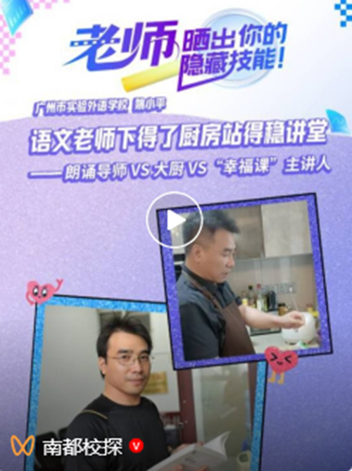 姚小平是广州市实验外语学校的语文老师。从教近30年来,除了课本上的知识,他更乐意教导学生课本外的知识和生活中的诗意。在学校,他为学生开设了《婚姻与家庭》的文化选修课,教学生学会爱和被爱;注重语文课的听说读写能力培养,教会学生如何发声和恰当表达;在生活中,他也也是一名烹饪高手,为家人烹饪营养美味的佳肴,在他看来,所有的教育,最终都是要落实到生活中去。