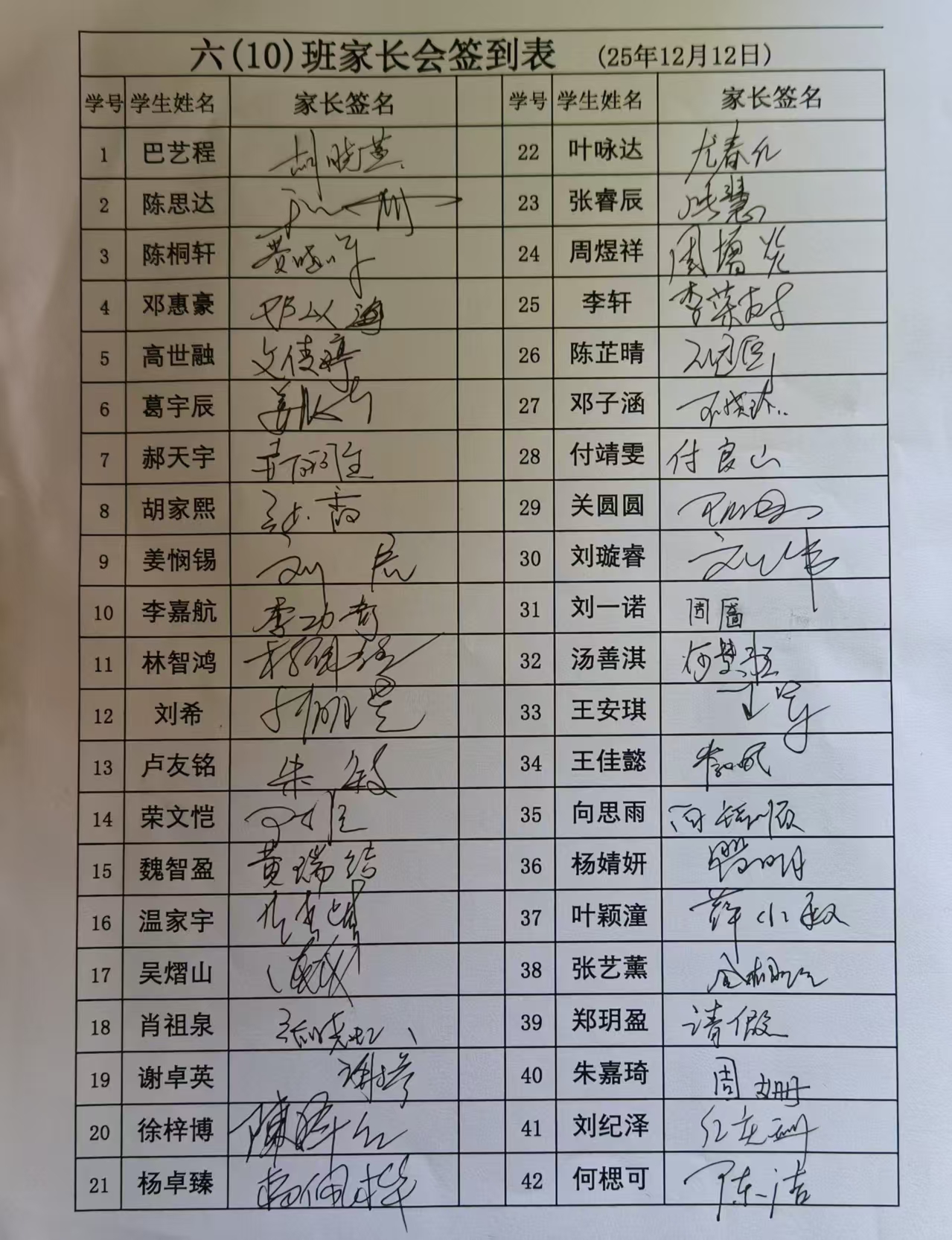 会中:家长和学生一起在教室开家长会,全班42名学生,除一名学生家长实在无法参加外,41名学生家长都到了。教室的家长会由两名学生主持,先是中队长致欢迎词,再由两名班长介绍班级的情况,再依次由数学韩老师、英语董老师、语文兼班主任肖老师发言,三位老师精心准备,紧紧结合班级的情况,给予了家长合适的指导。大约一个半小时的会议,家长和学生都很专心。结束后,学生、家长和老师在黄华楼门口拍摄了一张全家福。此次家长会,10班家长乘兴而来,满意而归。