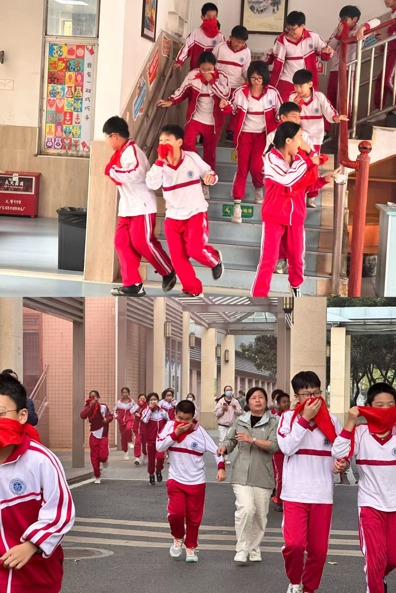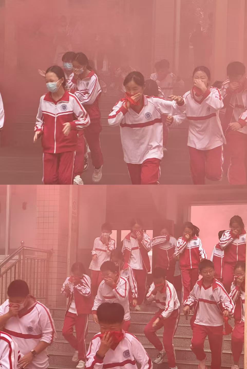 9点50分,随着报警器一声拉响,两所学校的一千多名学生分别从高低教楼的逃生通道紧张而有序地撤离教学楼。教室里,两校班主任与任课教师迅速反应,引导学生用湿毛巾捂住口鼻,保持弯腰低姿的安全姿势,按照预定路线有序撤离。过程中,师生们沉着冷静,不推挤、不逗留。为模拟真实火场场景,部分疏散通道还设置了烟雾模拟装置,进一步考验师生的应急反应能力。仅用时3分25秒,两校全体师生均安全抵达指定集合点,各班班主任及外籍教师立即清点人数并跨校汇总,确保无一人遗漏。