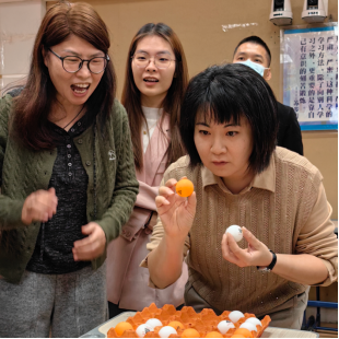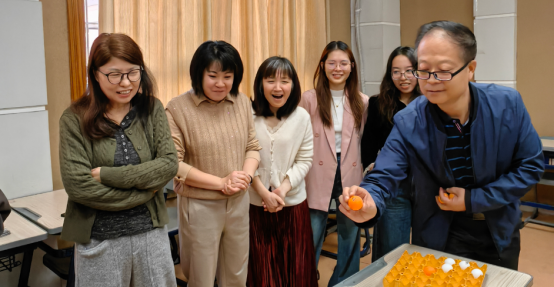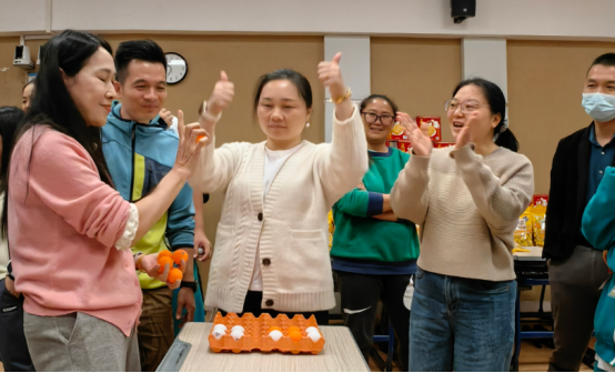 上午10:20(大课间期间),比赛随着裁判的一声令下正式开始,热闹而欢乐的浪潮瞬间席卷了4302教室。数学组与物理组老师们的竞争最为激烈,平时最讲究逻辑的老师们,卸下繁重的课业也会有一颗有趣、懂得发现美的心。每一次投掷,无论是否投中,都会换来最诚挚的欢呼。魏老师化身气氛组,在桌子旁转来转去,用掌声与呐喊精准地为每一位老师带来满满的情绪价值和自信心。