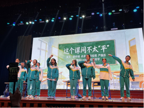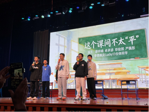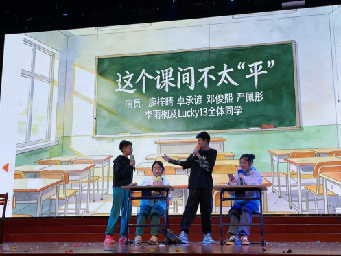 演出中段,原创Lucky13主题Rap以明快的节奏点燃全场,歌词中融入班级日常与成长思考,展现少年锐气;随后一曲《青春修炼手册》温情响起,熟悉的旋律搭配改编后贴近校园的歌词,引发全场轻声合唱。剧情推进至高潮,演员们通过极具张力的对手戏,自然引出“抄作业不如学思路,踏实努力才是真正捷径”的领悟,让欢笑沉淀为思考,使课间小品升华为成长寓言。