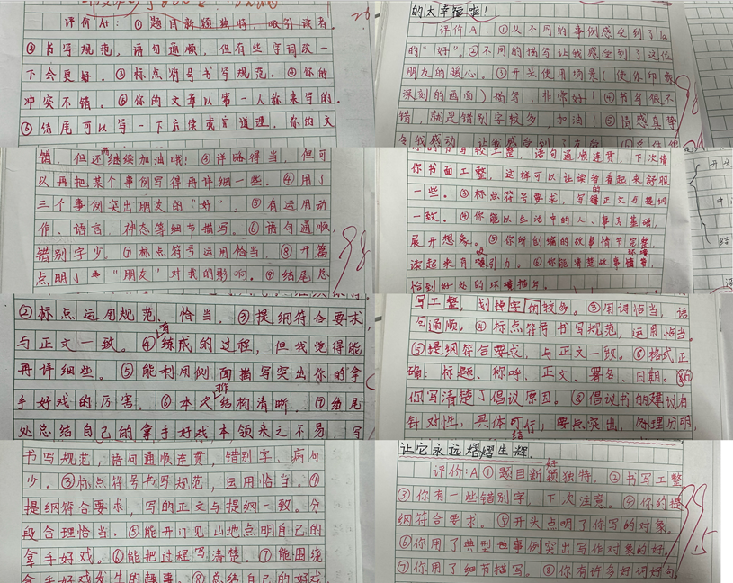 最后,语文老师们对每一篇作文进行精细化评改。通过“面批+集体评讲”的方式,老师既肯定学生的创意与亮点,也针对共性问题进行集中讲解,对个性问题则一对一指导修改方向。同时,老师还挑选优秀范文在班级内展示,让学生在借鉴中进步,在分享中成长。