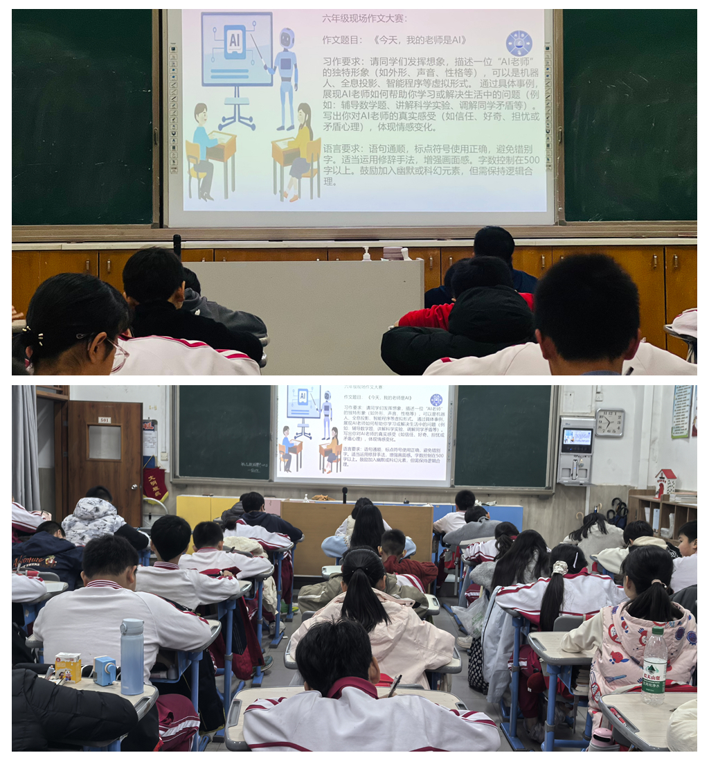 这是我校六年级语文组举办的“文采飞扬、笔墨生香”现场作文大赛现场。一个月前,活动就开始悄悄酝酿。语文老师们在课堂上带着孩子们读科幻片段,讨论人工智能新闻,甚至一起想象:“如果有一天,站在讲台上的是个机器人,会怎样?”
