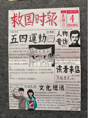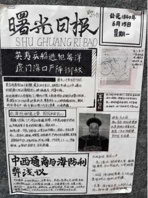同学们拿起画笔与钢笔,仿佛我们真的“穿越”了。有人回到1915年,在《新青年》报头下写下“德先生、赛先生,今日抵沪”;有人定格1937年,用《救国时报》的号外发出“卢沟桥的枪声”;还有人回到1949年,在《曙光日报》上宣告“天安门城楼上的庄严声音”。每一份报纸,都有我们精心设计的报头、用心绘制的配图、反复斟酌的标题。我们尝试走进历史人物的内心:在二版“专访”鲁迅先生,听他讲“横眉冷对千夫指”的铮铮铁骨;在三版“社会生活”里,还原那个年代的歌谣与衣衫,触摸战火中的烟火人间;在四版“副刊”上,我们以“穿越者”的身份,给林则徐写一封信,用漫画勾勒出百年兴衰的时间轴。