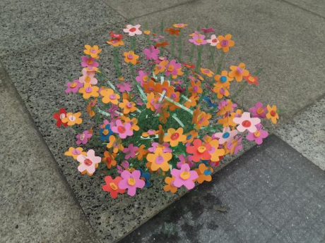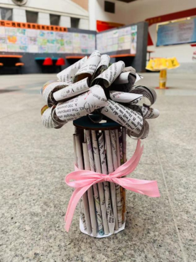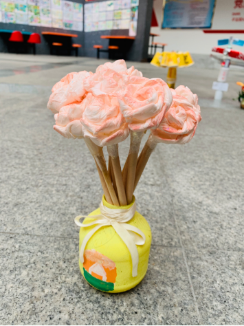 这是一个很有内涵的花束,因为我们是用英语试卷纸叠成的花,花瓶也是由英语试卷卷起来粘贴而成的,简约而不简单说的就是我了。