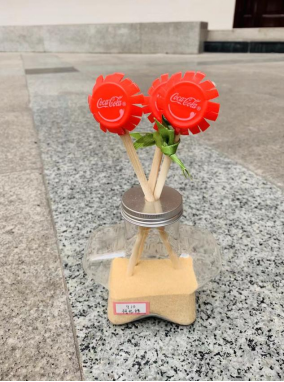 我也是一个拥有很强观赏性的花瓶哦,可爱的花花是由可乐瓶盖剪开侯粘在筷子上做成的花束样,星星形状的花瓶里装的是在改变带回来的金色细沙,组合在一起是不是很亮眼呀!