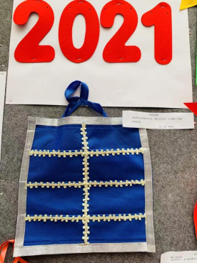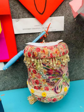 这是一个灯笼,它用到了旧窗帘布,裁剪后粘贴在一个小塑料桶边上,最后用扣子彩带进行装饰,成品我很喜欢,比赛结束我准备收藏起来。