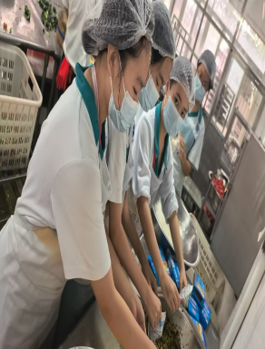 早上七点9名饭堂实践活动的同学就集中了,兵分两路,4名同学在初中部饭堂,5名同学在高中部饭堂,化身“食堂小帮手”。有的同学来到后厨,跟着厨师学习打鸡蛋、择菜,体验简单菜品的制作过程;有的负责为同学们分发加餐,每个环节都一丝不苟; “打饭的时候,我的手因为长时间端着餐盘变得酸痛,但当听到低年级同学说‘谢谢哥哥姐姐’时,所有的疲惫都消失了。”负责打饭的欧阳兆乐和黄晨曦同学说道。在体验过程中,同学们深刻体会到了食堂工作人员的辛苦——每天天不亮就要准备食材,在闷热的后厨忙碌数个小时,只为给全校师生提供可口安全卫生的饭菜。同学们要“光盘行动”。